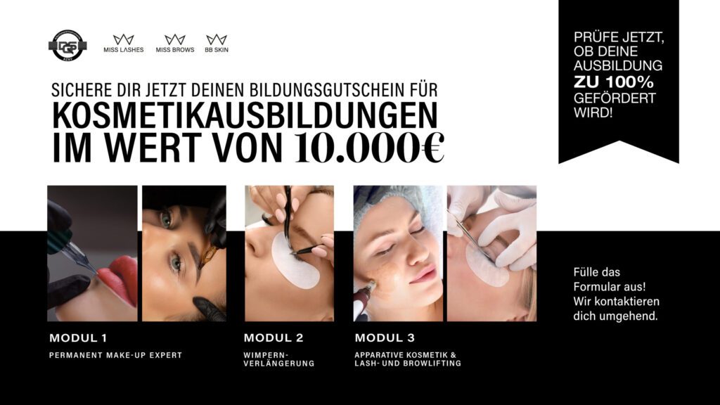 Nutze den Bildungsgutschein für kostenlose Schulungen in Permanent Make-Up, Wimpernverlängerung und BB Skin/Microneedling.